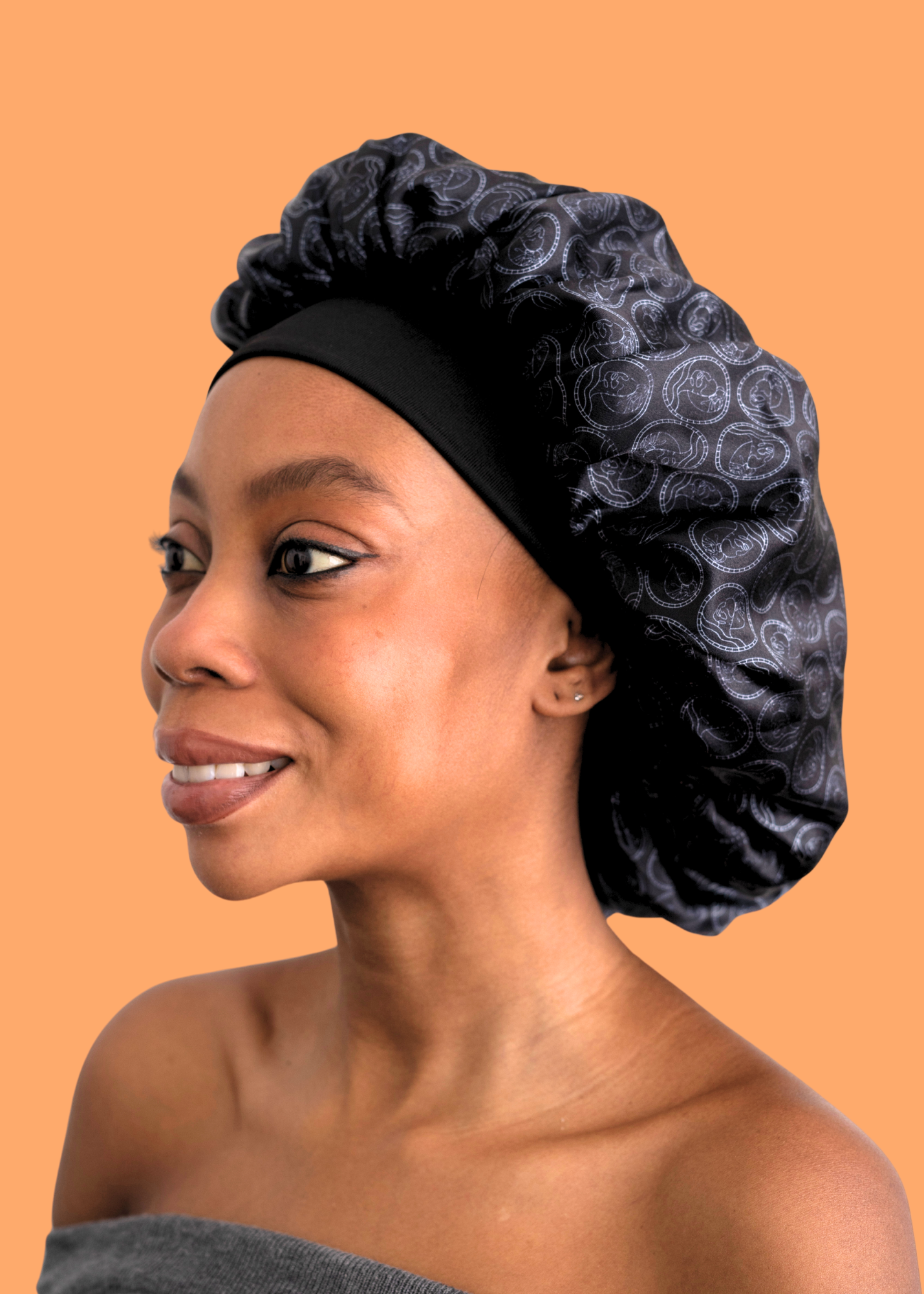 Our Luxe Obé Satin Bonnet is the perfect accompaniment gifted in every box. The height of stylish elegance, offering unparalleled comfort. Suitable for elevating your everyday wardrobe, wearing underneath your PHARAOH for its wicking benefits and to release your hands for tying your head scarf, or it can be used over your PHARAOH during conditioning and steam treatments.