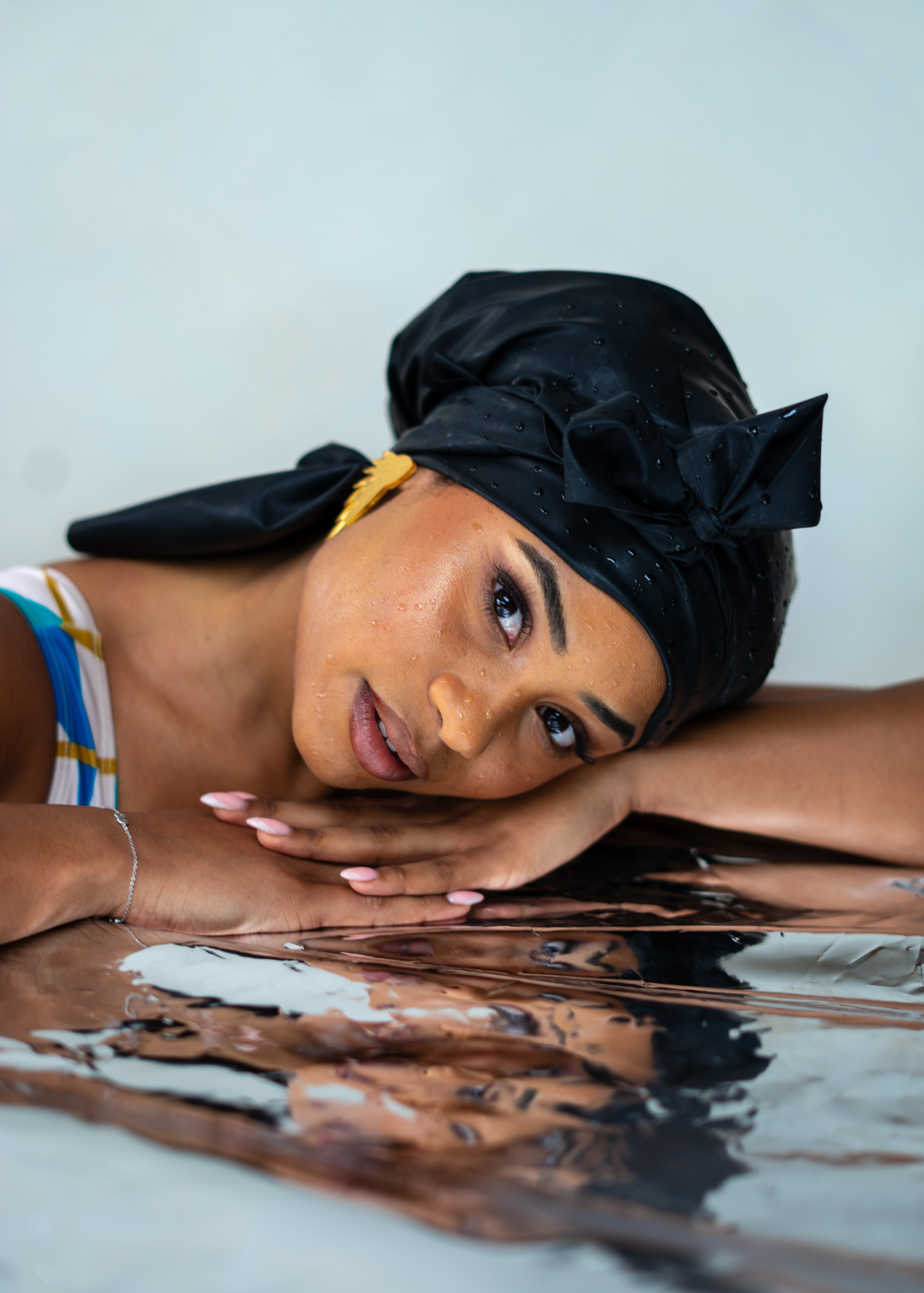 Obé waterproof head scarves are a fusion of fashion and function, creating a statement look while uniquely protecting your beautiful hair from water.